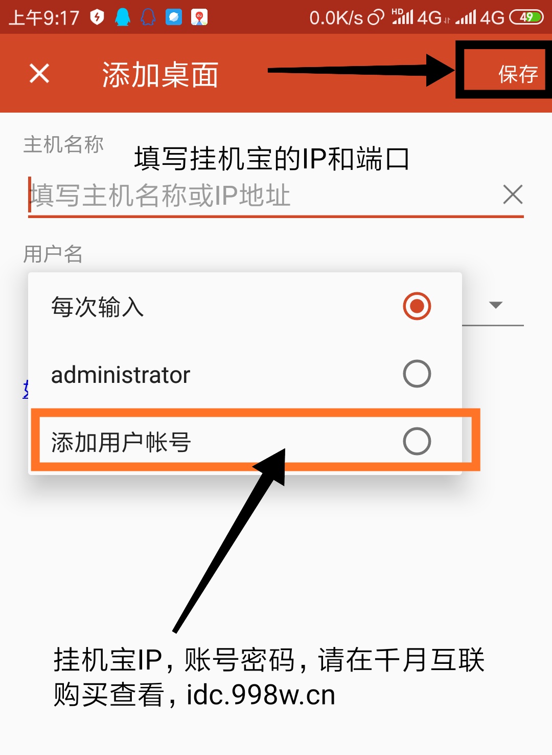 2.手机端打开微软远程桌面,点击桌面右上角的“+”号,添加挂机宝IP地址和登录帐号密码如图: