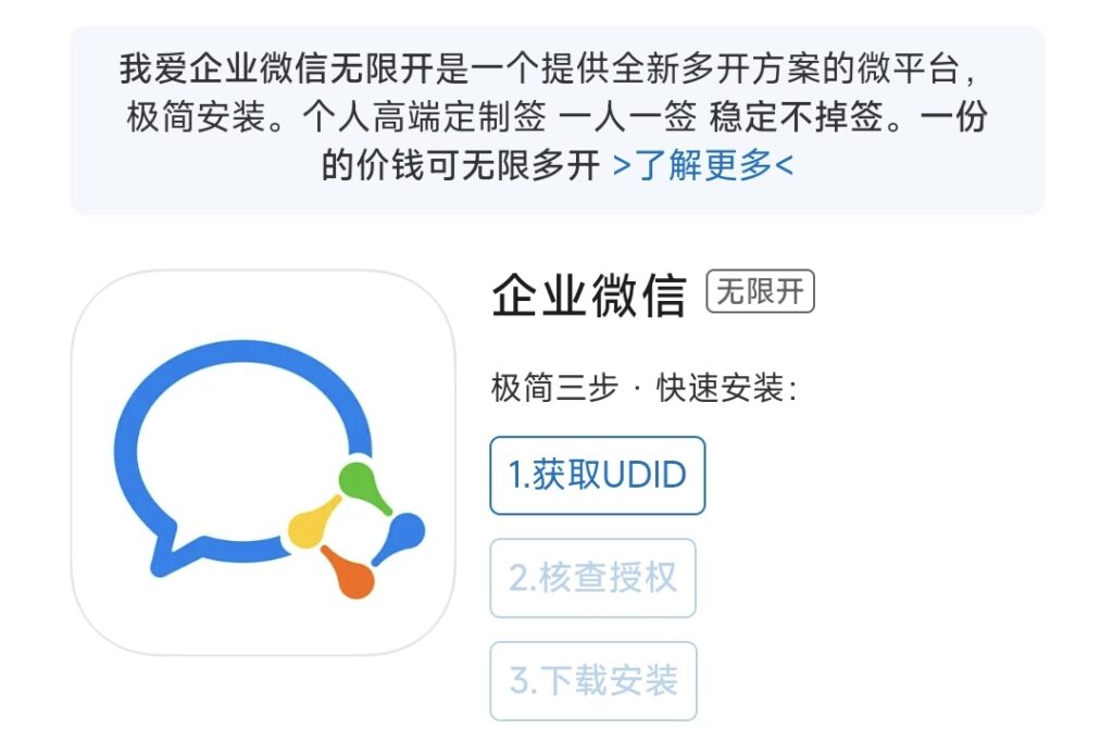 苹果企业微信分身多开,我爱多开平台是通过苹果官方开发者进行授权设备UDID定制从而实现稳定可靠的企业微信双开无限多开方式,市面上那种TF版只能使用90天而且不能无限分身,而且稳定性也堪忧。